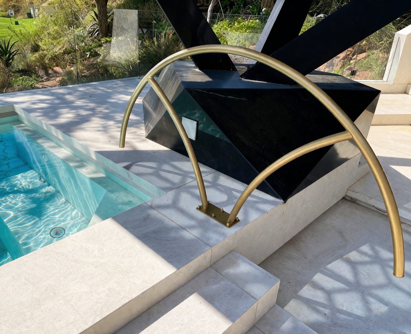 The Crescent design pool rail, available in powder-coated “Kruger Gold” & other custom colours, manufactured from Grade 304 stainless steel.
